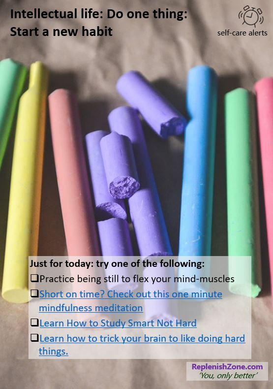 Self care alerts: Intellectual life: start a new habit Posted on 24th Oct 202018th Sep 2020 by Farrukh Akhtar Posted in self-careTagged self care; success; wellbeing; intellectual; intelligence; mind; think Share this:Tweet Related